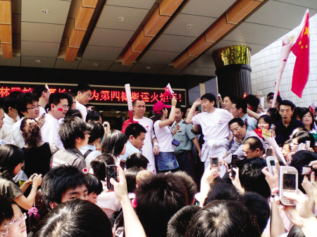 昨日上午10點(diǎn),陽光假日酒店,80多名祥云粉絲圍住了剛剛接力完的火炬手——福建省青聯(lián)副主席、福建省青年企業(yè)家協(xié)會會長林騰蛟(圖中舉火炬者)。粉絲們一個接一個要求合影,還不斷地提問。林騰蛟微笑著一個一個地解釋,與大家分享火炬?zhèn)鬟f的喜悅。