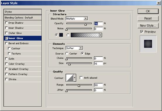 建一新層 – 命名為 Eye。 畫一正圓填充選擇區(qū)域為你希望眼睛的顏色。 接著按以下設(shè)置應(yīng)用 Inner Glow 圖層特效。