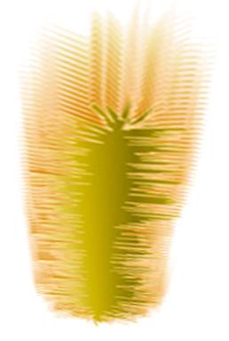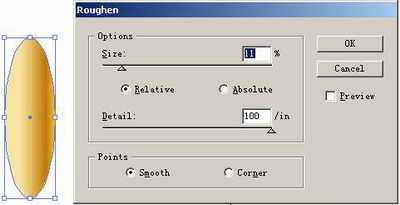 二、復(fù)制圖二中所畫橢圓,將顏色稍微調(diào)暗一些,并縮小,我們稱之為圖形2。這樣我們得到的是兩個顏色和大小有點區(qū)別的橢圓圖形。對圖形1運用Illustrator里的濾鏡:Filter/Distort/Roughen(參數(shù)選擇:Size:11;Detail:100;Points:Smooth)制作出蘆葦毛毛參差不齊的效果。如圖所示: