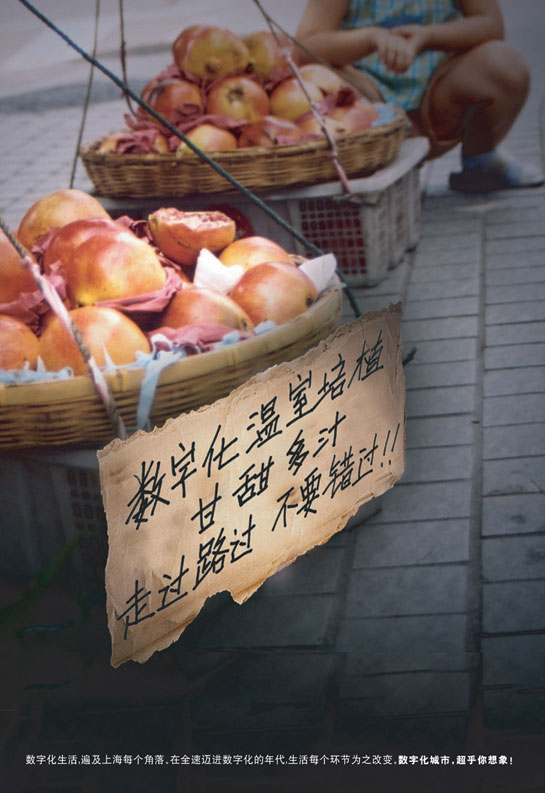 我在上海,信息化也在! 依稀記得這好像是參加“上海信息化”公益廣告的作品,還拿了五金類的一個(gè)獎(jiǎng)項(xiàng)(金銀銅鐵記不清了)。該是近在咫尺,直擊我身邊生活的創(chuàng)意。畫面直接把街道一角赤裸裸地搬出來,與“信息化”銜接的重?fù)?dān),一股腦全壓在文字的肩上。偷懶的廣告,會(huì)有好廣告,但少有讓人擊節(jié)的妙廣告;文字(畫面)一邊倒的廣告,亦然。