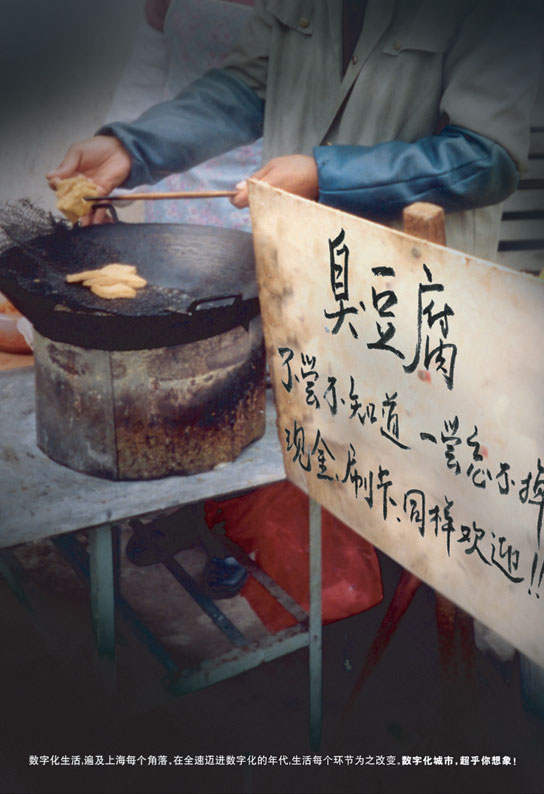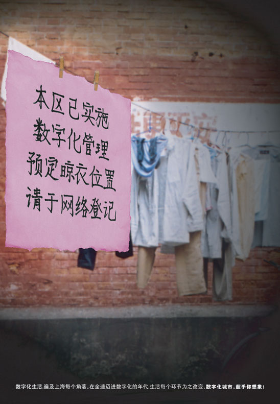 而晾衣篇,雖然網(wǎng)絡(luò)預(yù)約也藏在畫面深處,但實(shí)際生活中大家都有這樣的體驗(yàn):晾衣服即使沒有位置,一般也會(huì)自己創(chuàng)造出位置。在生活中找不到落點(diǎn),讓它比起水果攤篇略顯不足。余下的兩張,不論足療數(shù)字化還是刷卡買豆腐,都是將市民生活的一角放大,讓文字描繪的信息化與畫面上的手工作業(yè)的現(xiàn)實(shí)做強(qiáng)扭,讓人感覺很王婆。畫面源于生活,描述的事實(shí)卻“超乎想象”,很像堂•吉柯德堅(jiān)持認(rèn)為風(fēng)車就是巨人,全然不理會(huì)世界在別人眼里的看法;蛟S不遠(yuǎn)的將來,我們真的能夠?qū)崿F(xiàn)買賣隨處數(shù)字化,但至少我希望,那時(shí)候我所接觸的生活,最好比畫面所表現(xiàn)的生活要品質(zhì)許多。