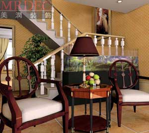 主要建材:地面:斯米克地磚、菠蘿格地板;墻面:東鵬墻磚、多樂士墻面漆、胡桃木飾面板;鐵藝欄桿;衛(wèi)生間:墻地磚、合資品牌潔具;廚房:科曼多廚柜。
