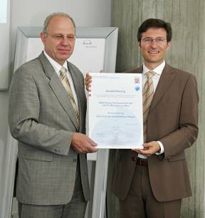 環(huán)保部部長 Dietzel先生(左)把“Glanzlicht-Urkunde”環(huán)保重要證書頒發(fā)給曼羅蘭集團董事會成員曼仕龍博士。