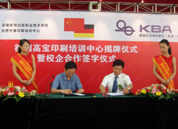 2007年5月25日,德國高寶印刷培訓(xùn)中心揭牌儀式暨校企合作儀式在安徽新聞出版職業(yè)技術(shù)學(xué)院隆重召開。安徽省新聞出版局助理巡視員盛大全先生、德國高寶公司亞太銷售總經(jīng)理海杜克先生、安徽新聞出版職業(yè)技術(shù)學(xué)院程德和院長、德國高寶大中華區(qū)首席代表岑寒先生、安徽省印刷協(xié)會王德明秘書長、安徽新聞出版局印刷處胡文生處長、安徽新聞出版職業(yè)技術(shù)學(xué)院吳鵬副院長等領(lǐng)導(dǎo)以及印刷業(yè)的同仁和新聞媒體的朋友們共同出席了此次活動。