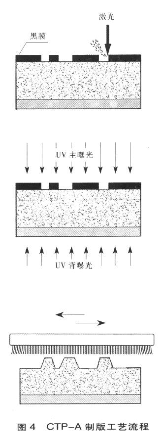 ●CTP-T CTP-T作為最新的系統(tǒng)發(fā)表于DRUPA2000上。該系統(tǒng)最大的特點(diǎn)是在制版過(guò)程中不使用清洗劑.由于不需要清洗機(jī)和溶劑回收裝置 該制版系統(tǒng)非常緊湊、環(huán)保,處理時(shí)間也明顯縮短了。 CTP-T的基本概念如下: 開(kāi)始成像過(guò)程與CTP-A相同,不同的是取消了清洗工序,代之以紅外加熱處理,不需要的非圖文部經(jīng)加熱產(chǎn)生凝膠化,凝膠化的樹(shù)脂使用專用特殊的無(wú)紡布來(lái)清除,然后經(jīng)UV曝光即完成制版過(guò)程,整個(gè)工藝與傳統(tǒng)的制版工藝以及CTP-A?CTP-I工藝相比都縮短了。