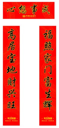春聯(lián)的種類(lèi)比較多,依其使用場(chǎng)所,可分為門(mén)心、框?qū)、橫披、春條、斗斤等!伴T(mén)心”貼于門(mén)板上端中心部位;“框?qū)Α辟N于左右兩個(gè)門(mén)框上;“橫披”貼于門(mén)媚的橫木上;“春條”根據(jù)不同的內(nèi)容,貼于相應(yīng)的地方;“斗斤”也叫“門(mén)葉”,為正方菱形,多貼在家俱、影壁中。(五福臨門(mén)燕哺和諧春暖意,八方凝愛(ài)牛耕錦繡世情濃 )
