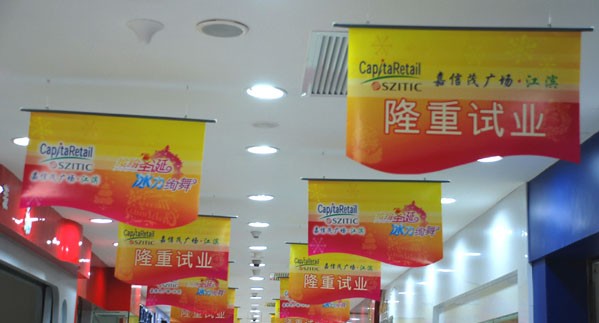 四、吊旗的作用:舞臺(tái)上使用吊旗,吊旗隨風(fēng)飄揚(yáng),非常富有動(dòng)感,可以起到烘托現(xiàn)場(chǎng)氣氛的作用。商場(chǎng)里面使用吊旗,可以最大限度地?cái)U(kuò)大廣告面積,而且吊旗懸掛的比較高,在琳瑯滿目的物品和高聳的貨物架面前,可以迅速的抓住顧客的眼球。很多售樓部也可見(jiàn)大量吊旗,這些多是為了展示企業(yè)品牌,起到塑造品牌形象的效果。吊旗具有美觀、簡(jiǎn)潔、大小長(zhǎng)短自由組成,方便保存,拆裝方便等特點(diǎn)。