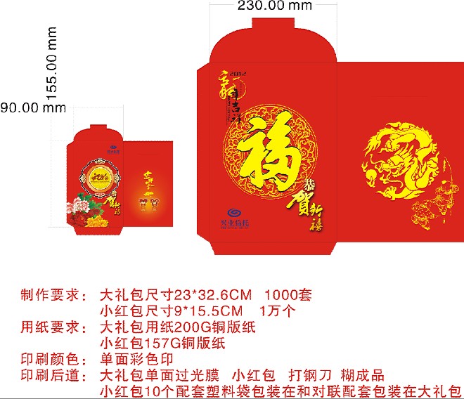 眾印網(wǎng)在春節(jié)特推出新年禮包印刷業(yè)務(wù),新年禮包主要包括:大禮包(尺寸23*32.6cm、材料為200g銅版紙)、小紅包(尺寸9*15.5cm、材料為157g銅版紙)、對(duì)聯(lián)(尺寸100*20cm、材料為157g銅版紙)、橫批(尺寸50*20cm、材料為157g銅版紙),單面彩色印刷,大禮包單面過(guò)光膜,小紅包10個(gè)、對(duì)聯(lián)一套包裝在大禮包里面。如需以上新年禮包印刷尺寸不適合您,請(qǐng)與客戶人員聯(lián)系。 紅包袋是包著金錢作為紅包送人的包裝封套,粵語(yǔ)稱利市封。相傳送紅包的習(xí)俗,在很久以前就流行。紅包袋印刷精美,除了傳統(tǒng)的紅色外,還有金色的封套,除了平面印刷和燙金印刷的吉祥圖案、生肖圖案外,還有立體雷射印刷和卡通人物圖案的。圖案多以簡(jiǎn)單爲(wèi)主,再配以吉利的字句。