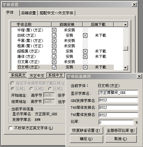如果后端僅安裝了博雅宋GB和748,又無相應(yīng)的配置工具, 可暫用“歪”法在飛騰4里使用后端的博雅宋: