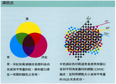 印刷機用有限色彩數(shù)量的一套油墨(只有黑墨或青、品紅、黃、黑墨)印刷不同大小的細小點的矩陣,由此可以給肉眼產(chǎn)生許多灰度級或許多顏色的幻覺。