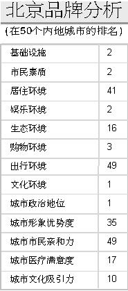 藍(lán)皮書對(duì)中國(guó)內(nèi)地50個(gè)城市的總體品牌指數(shù)進(jìn)行比較研究后發(fā)現(xiàn),北京位列第一,上海、深圳、廣州緊隨其后。其中,社會(huì)文化環(huán)境、城市政治地位等項(xiàng)的排名,北京排名都比較靠前。