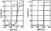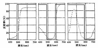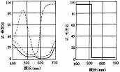 由于受到油墨色料和生產(chǎn)工藝的限制,四色印刷使用的C、M、Y、K基色油墨印刷顯色的光譜曲線(xiàn),與理想顏色光譜曲線(xiàn)有較大差距。理想油墨和實(shí)際油墨光譜反射率曲線(xiàn)如下: