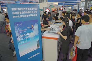 由于深圳成功獲得2011年第26屆世界大學生夏季運動會的主辦權,受大運會籌備委員會的委托,海德堡率先服務大運會,在展會上用海德堡印刷機現(xiàn)場印制大運會海報——“第26屆世界大學生夏季運動會,深圳歡迎您”、“深圳,與世界沒有距離—Shenzhen Embraces the World”等海報設計、印刷均堪稱一流。海德堡展區(qū)因此吸引了無數的參觀者,也贏得了他們的不絕贊嘆聲,成為此次文博會中一道靚麗的風景。