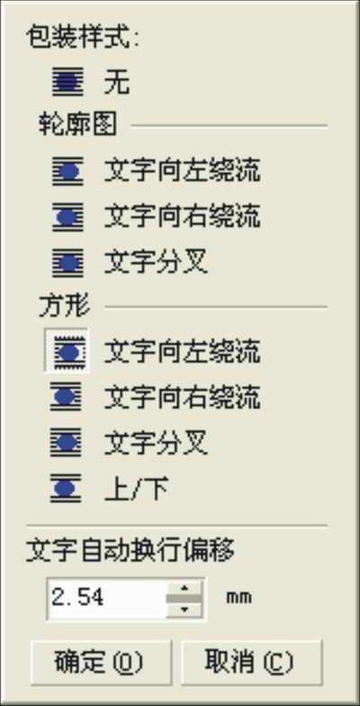 插入圖片到文字中的工作非常簡單,只需要選中要插入的圖片,在格式工具欄上的“段落文本繞圖”中設定一下即可。在該工具中,CorelDRAW為我們提供了豐富的文本繞圖功能,可以將圖片或左或右、或上下或四邊圍繞等等,如圖。