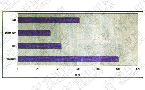 圖2所示,在工作狀態(tài)下,熱固裝置和EB系統(tǒng)每小時所需的費用差不多,而普通UV系統(tǒng)和惰性UV系統(tǒng)每小時所需的費用與其相比高出了8%左右。同時兩者每小時的生產(chǎn)輸出有較大差別,與熱固和冷固裝置相比,普通UV系統(tǒng)和惰性UV系統(tǒng)低一些,但是這種差距在慢速單幅印刷設備上表現(xiàn)得不是很明顯。