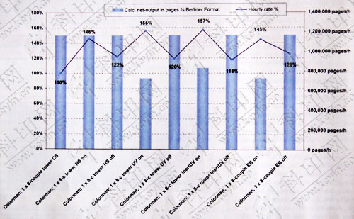 在加工同一具有代表性的印刷品的前提下,總體成本反映出了準備時間、生產(chǎn)速度以及油墨和紙張更換時間的不同。為了對比所有成本因素這是一個主要的計算方法。樣本是一個幅面為9.25×12.4英寸且共有16頁的簽名冊,試驗過程中需要應用配置不同干燥系統(tǒng)的印刷機在6種紙張上印刷10萬份。